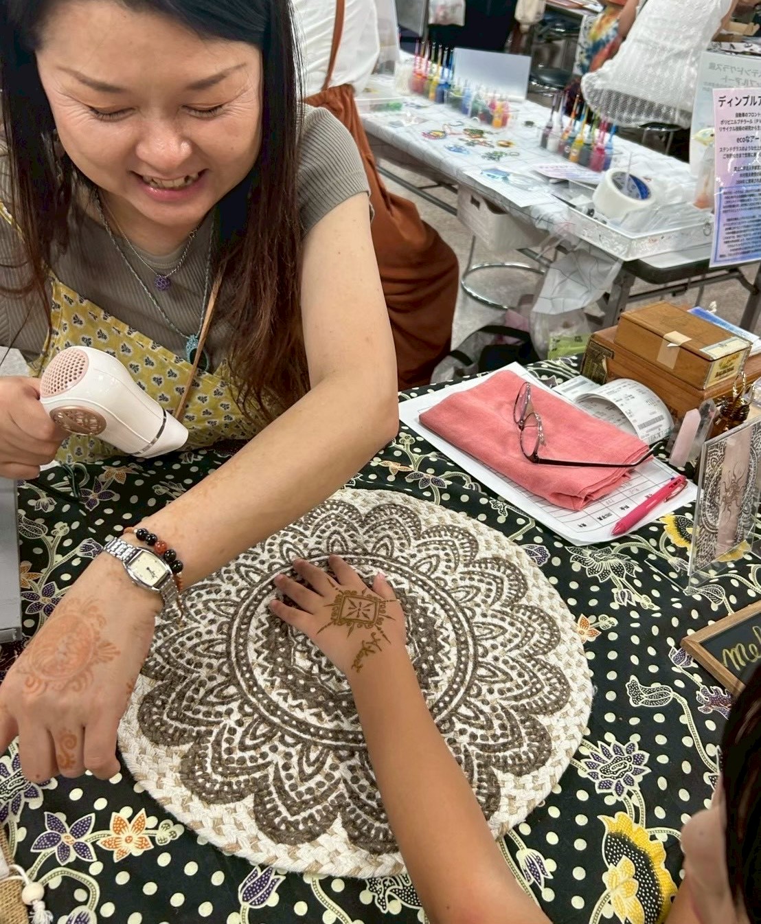 「横須賀盛り上げ隊」ブースのメンディアート体験では、繊細な筆使いに体験者にとって心躍る時間となったようです。子どもも大人も技術とセンスの光るアートを満喫していました。