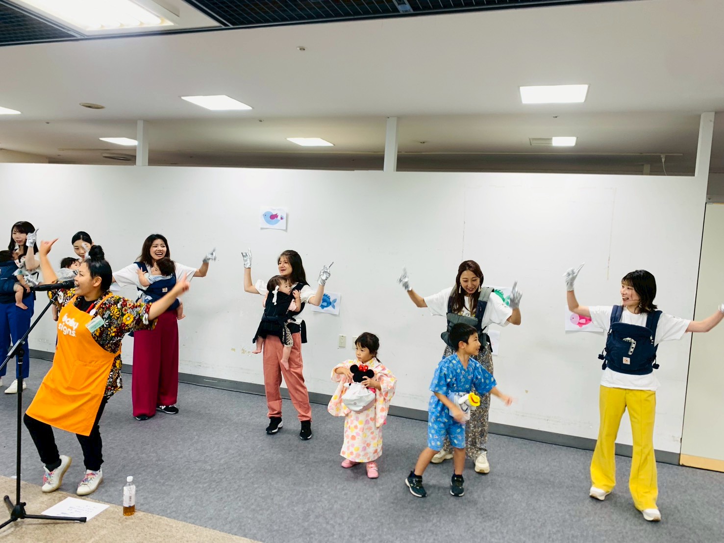 川崎エリアで活動するベビーサイン講師(左手前)と抱っこdeダンス認定講師(右端)、お母さんと抱っこ紐の中にいる赤ちゃんによる「ベビーサインde抱っこdeダンス」のステージ発表が行われました。親子の触れ合いと絆を深め、貴重な抱っこ期間の思い出となったようです。